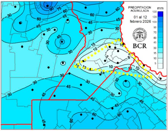 Con estas últimas lluvias, la región núcleo logra alcanzar la media de la primera quincena de febrero que se ubica en los 60 mm. La media de las 36 estaciones meteorológicas de la red GEA/BCR muestra un promedio de 62 mm. Hay localidades que recibieron en ese periodo más de 100 mm como Carlos Pellegrini, Pozo del Molle, Irigoyen o Rufino. Lamentablemente, también están las localidades en la que media de esta primera quincena están por debajo de los 40 mm como Guatimozín, Álvarez, Ramallo, Santa Teresa, Baradero y Colonia Almada.