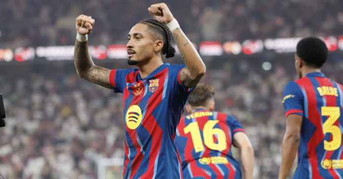 En el complemento, el Barcelona volvió a golpear. A los 72 minutos, Raphinha apareció otra vez y, con un remate desde la frontal del área que se desvió tras un resbalón, marcó el 3-2 definitivo, desatando el festejo azulgrana.
