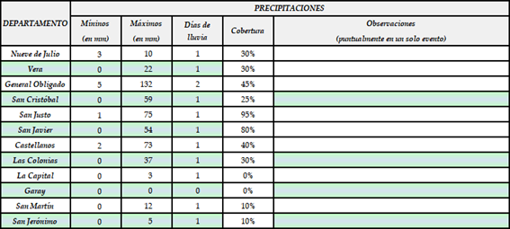 El informe del Sistema de Estimaciones Agrícolas para el Centro Norte de la Provincia de Santa Fe informa sobre la ocurrencia de precipitaciones de variada intensidad y distribución, sobre todo en los departamentos del norte de la región SEA.