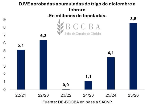 En línea con las mayores compras del sector exportador, hasta febrero se registraron Declaraciones Juradas de Venta al Exterior (DJVE) por 8,5 millones de toneladas de trigo pan, lo que representa el 31% de la producción estimada para dicha campaña. Este volumen evidencia un crecimiento del 106% con respecto a las DJVE registradas y aprobadas durante el mismo periodo del ciclo previo, ubicándose en los valores más elevados de los últimos años.