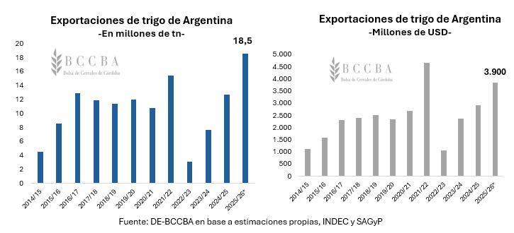 Las exportaciones para la campaña actual se proyectan en 18,5 millones de toneladas, lo que representaría el mayor volumen exportado de la historia. Este nivel de ventas al exterior se traduciría en un ingreso de divisas por alrededor de USD 3.900 millones. Sin embargo, a pesar del récord en volumen exportado, los ingresos no se ubicarían en el mismo sentido debido a las menores cotizaciones del cereal en los mercados internacionales.