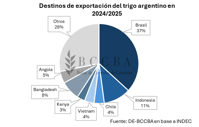 En lo que va de la campaña 2025/2026, se observa una mayor participación de mercados asiáticos: Bangladesh, Vietnam e Indonesia concentraron el 21%, 20% y 16% de las exportaciones argentinas de trigo, respectivamente. Brasil, por su parte, representa el 9% de las ventas de trigo argentino, ocupando el cuarto lugar. Sin embargo, esta situación se irá modificando a medida que avance el ciclo comercial que se extiende hasta el mes de noviembre.