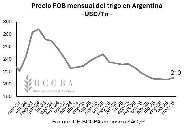 En el plano de las cotizaciones, la amplia disponibilidad de trigo tanto en el mercado local como internacional se refleja en una tendencia bajista en los precios. En este contexto, Argentina mantiene uno de los valores FOB más bajos entre los principales exportadores, lo que le permite sostener su competitividad frente a otros competidores en el mercado internacional dado las distancias y sus consiguientes costos de fletes. En lo que va de marzo, la cotización FOB del trigo argentino publicado por SAGyP se ubicaría en torno a los USD 210 por tonelada.