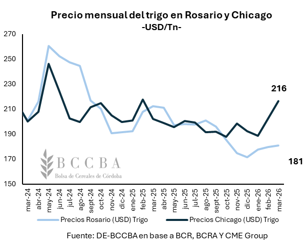 En el mercado local, el precio del cereal en Rosario para marzo se posicionaría en USD 181 por tonelada, lo que representa una caída del 15% respecto al mismo periodo del año previo. Por su parte, la cotización en Chicago se encuentra en un terreno más sostenido, alcanzando los USD 216 por toneladas, USD 14 por encima del valor registrado el año anterior.