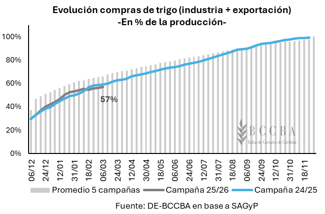 De acuerdo con los últimos datos brindados por la Secretaría de Agricultura, Ganadería y Pesca de la Nación (SAGyP), en lo que va del ciclo comercial 2025/26 del trigo, las compras del sector exportador han alcanzado 13,6 millones de toneladas correspondientes a la campaña 2025/26, casi 5 millones de toneladas por encima del ciclo anterior. Con exportaciones proyectadas en 18,5 millones de toneladas, el sector exportador debería adquirir casi 5 millones de toneladas adicionales. Mientras que, el sector molinero lleva adquiridas 2,1 millones de toneladas, en línea con igual período del año previo, restándole adquirir 4,9 millones de toneladas para el resto del ciclo comercial, que totalizaría con una molienda de 7 millones de toneladas proyectadas.