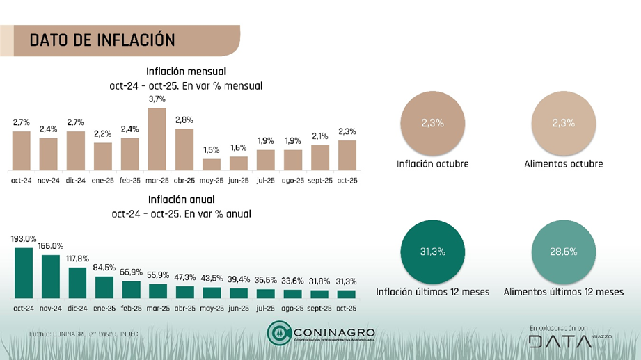INDEC informó que la inflación de octubre de 2025 fue del 2,3%, el valor más alto desde abril de este año. De esta forma, los precios al consumidor superaron el 2% por segundo mes consecutivo, luego de cuatro meses por debajo de ese nivel. Este repunte se vinculó principalmente con la volatilidad cambiaria observada en la previa de las elecciones legislativas. Con este resultado, la inflación acumuló un incremento del 24,8% en los primeros diez meses de 2025 y un 31,3% en la comparación interanual.