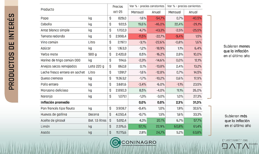 El impacto se observa con mayor intensidad en productos como la arroz, vino y yerba mate, donde los costos han aumentado por encima de los precios, afectando la rentabilidad de los productores. Esta situación se replica en varias economías regionales que abastecen el mercado interno. Por poner algunos ejemplos: en el último año la papa ha perdido el 40,5% de su valor real, la cebolla el 29% de su valor real y el arroz 25%.