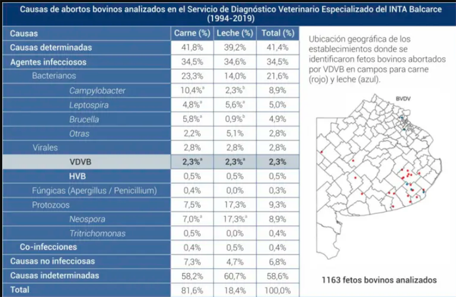 La relación entre DVB y desordenes reproductivos ha sido documentada en numerosos trabajos y es una de las principales causas de pérdidas económicas. Sin embargo, la confirmación diagnóstica no siempre resulta sencilla. En la casuística del Servicio de Diagnóstico Veterinario Especializado del INTA Balcarce, los abortos asociados a infecciones con DVB representan la principal causa viral, siendo responsable del 2,3% de los abortos en sistemas de producción de carne y leche de la región Central de Argentina (Cantón et al., 2022, Spetter et al., 2022) (Tabla 1).