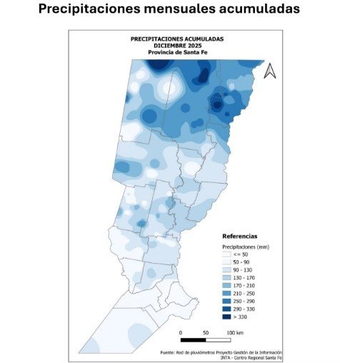 Para elaborar el mapa provincial de precipitaciones acumuladas se utilizaron los registros de la red de pluviómetros de la provincia de Santa Fe, un espacio colaborativo conformado por productores, instituciones, organizaciones y las agencias de extensión del INTA en Santa Fe, que cuenta actualmente con más de 160 pluviómetros distribuidos en todo el territorio provincial.