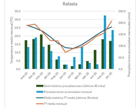 En Rafaela, tanto las temperaturas mínimas como las máximas fueron superiores a las estadísticas históricas, resultando una temperatura media casi 4°C superior al promedio de los últimos 30 años.