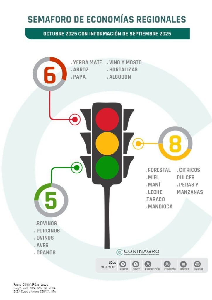 Durante septiembre, el Semáforo de Economías Regionales registró 5 actividades en verde, 8 en amarillo y 6 en rojo. En comparación con el mes anterior se observaron desmejoras, ya que dos actividades cambiaron de categoría, destacándose los casos de algodón, peras y manzanas, que mostraron retrocesos.