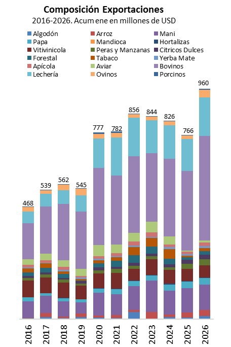 En el primer mes de 2026, las 19 actividades agropecuarias y economías regionales relevadas registraron exportaciones por USD 5.032 millones, lo que implica un incremento del 44% respecto del promedio histórico de la última década para el mismo período (USD 4.072 millones). La estructura exportadora del mes muestra una marcada concentración: el 80% de los ingresos provino de los complejos granarios (soja, maíz, trigo, girasol, cebada y sorgo), mientras que el sector bovino explicó otro 9%. El 11% restante, equivalente a unos USD 525 millones, fue aportado por el conjunto de las demás economías regionales.