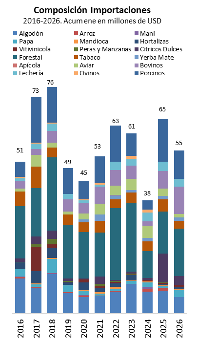 En cuanto a las importaciones, durante enero se registraron compras externas por USD 82 millones (vs. USD 5.032 millones de exportaciones). Nuevamente, el complejo granario lideró la composición, explicando el 30% del total. Le siguieron la actividad forestal (22%), el sector porcino (11%) y el algodonero (10%), mientras que el 11% restante se distribuyó entre otras actividades de menor participación.