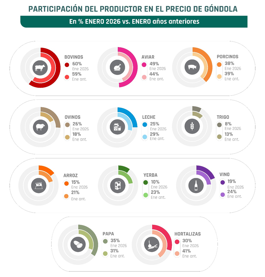 En los productos regionales, en cambio, se observa en general una pérdida de participación del productor respecto de los valores históricos. Las caídas más marcadas se dieron en yerba mate y hortalizas, con reducciones de 13 y 11 puntos porcentuales frente al promedio de los eneros de años anteriores. En la yerba mate, la participación actual ronda el 10%, mientras que el promedio histórico para enero se ubicaba cerca del 23%. En hortalizas, la participación actual es del 30%.