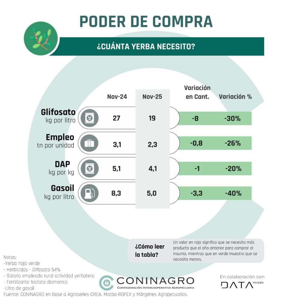 En cuanto a los costos laborales, en noviembre de 2025 se requirieron 2,3 toneladas de hoja verde para afrontar el pago de salario mensual del peón yerbatero, frente a las 3,1 toneladas necesarias un año atrás. También se observan mejoras en las relaciones con fitosanitarios y fertilizantes, del 30% y 20%, respectivamente.