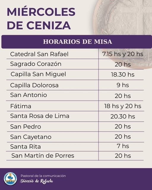 En nuestra ciudad hay varios horarios de misas: Catedral San Rafael a las 7:15 y 20:00 horas, Sagrado Corazón a las 20:00, capilla San Miguel a las 18:30, capilla La Dolorosa a las 9:00, San Antonio a las 20:00, Fátima a las 18:30 y 20:00, Santa Rosa de Lima a las 20:30, San Pedro a las 20:00, San Cayetano a las 20:00, Santa Rita a las 7:00 y San Martín de Porres a las 20:00.