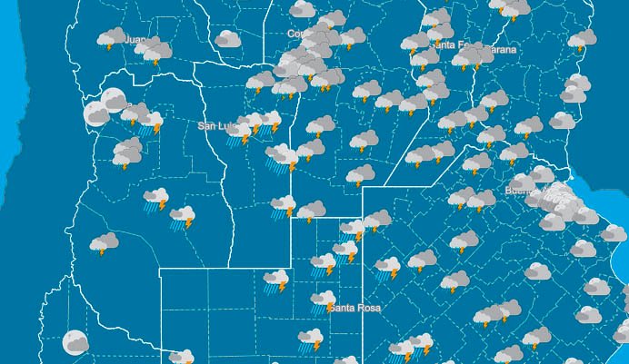 A continuación, el mapa de tormentas y precipitaciones que muestra el Servicio Meteorológico Nacional para este fin de semana:
