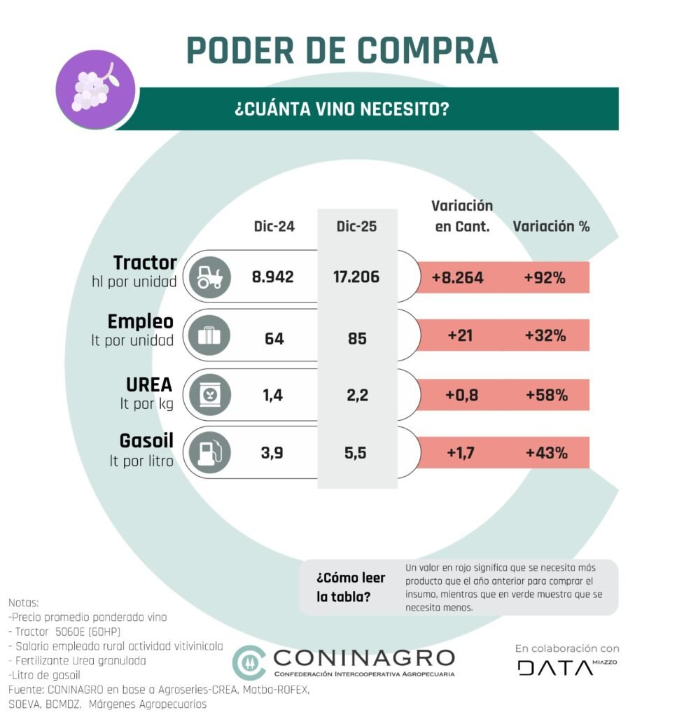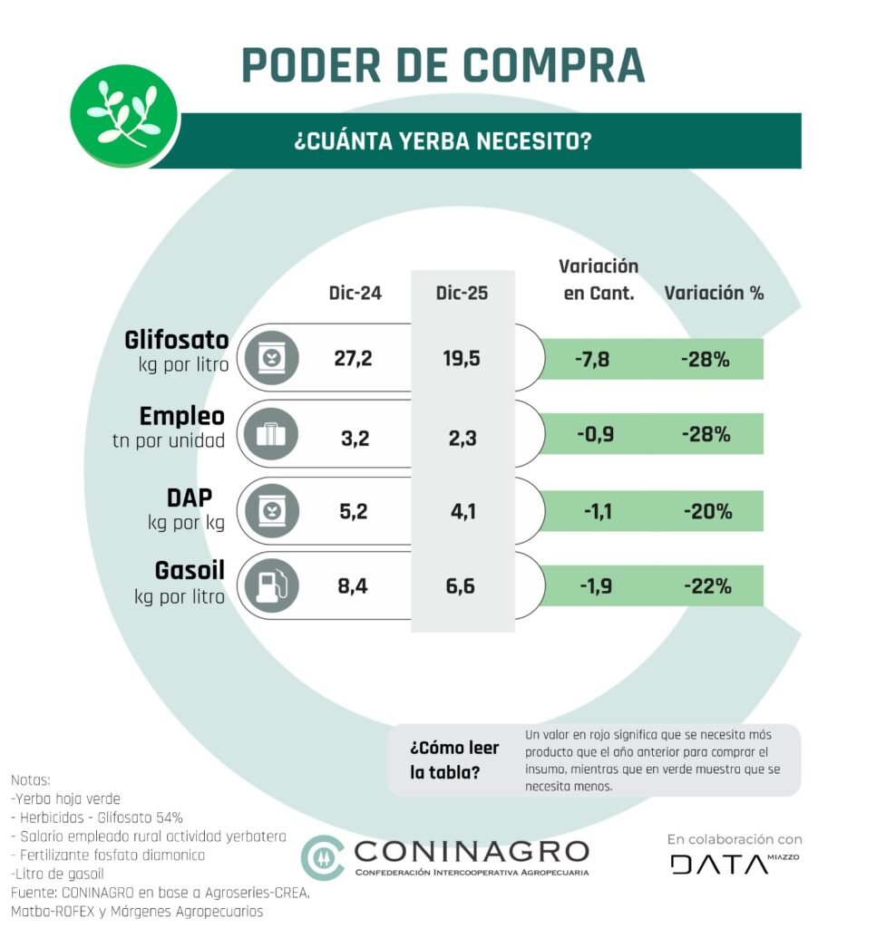En su informe mensual, CONINAGRO analizó el poder de compra de ocho productos clave de la producción agropecuaria en Argentina: soja, maíz, trigo, ternero, novillito, leche, yerba y vino. Este indicador mide la capacidad de estos productos para adquirir una amplia gama de insumos, costos e inversiones del sector, que incluyen herbicidas, fletes, maquinaria y otras 20 variables analizadas.