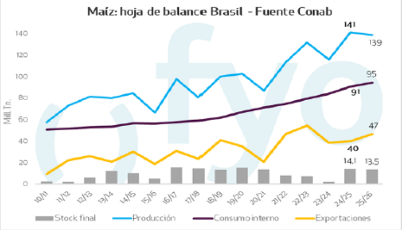 Un elemento que tensiona el balance de suministros en Brasil es el creciente consumo de maíz para la industrialización, específicamente para la producción de etanol. Brasil proyecta un récord histórico en este biocombustible, alcanzando los 8.980 millones de litros (+14,5% anual).
