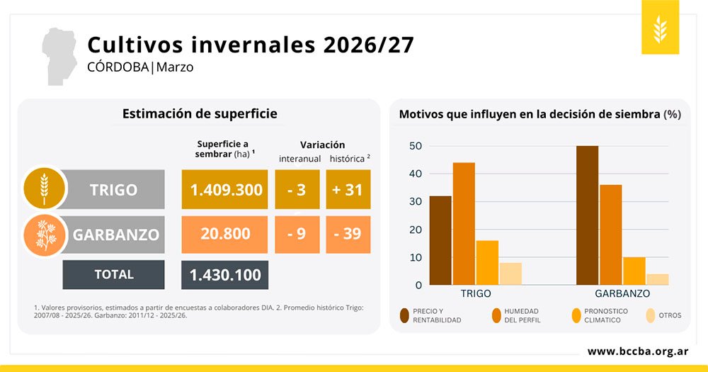 Para el caso del trigo, desde la Bolsa de Cereales de Córdoba indicaron que la superficie registraría una disminución interanual de 38 mil hectáreas. No obstante, el área sembrada se mantendría por encima del promedio histórico, en línea con lo observado desde la campaña 2024/25.