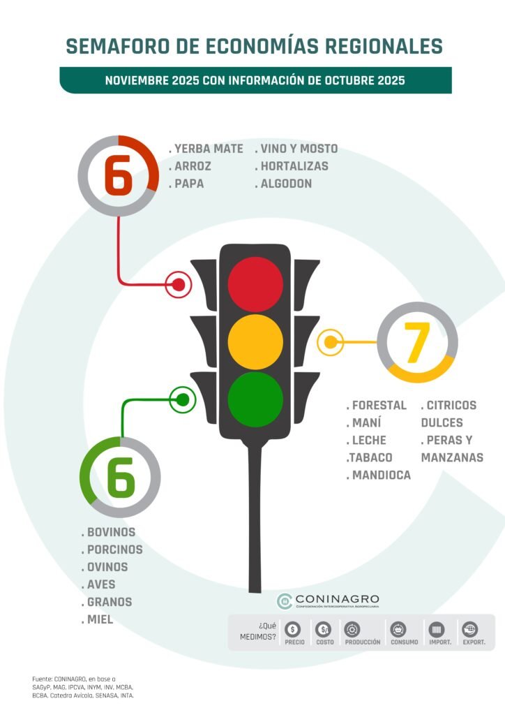 Durante octubre de 2025, el Semáforo de Economías Regionales registró 6 actividades en verde, 7 en amarillo y 6 en rojo. En comparación con el mes anterior, se observaron mejoras: la actividad apícola mostró tendencias favorables y confirmó su paso de amarillo a verde.