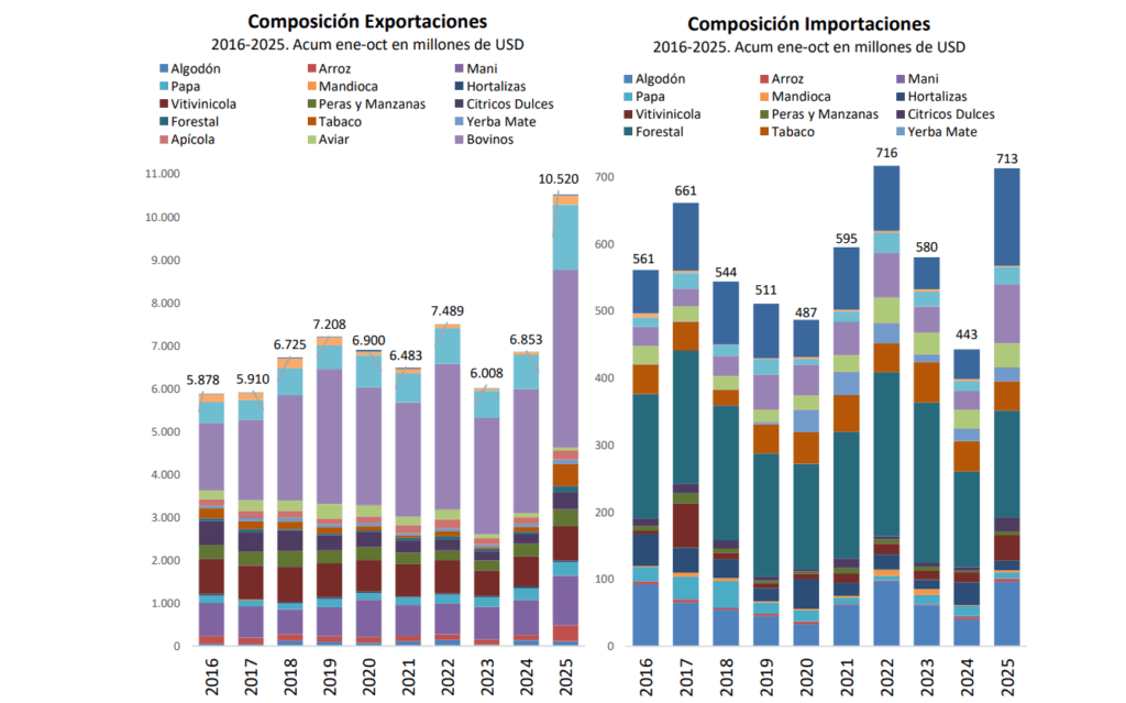 El análisis del plano internacional permite ver con claridad cómo las economías regionales participan del comercio global y qué sectores son los que realmente impulsan la generación de divisas. Al observar el comercio exterior acumulado entre enero y octubre de 2025, aparece una estructura muy concentrada en unos pocos complejos primarios que explican la mayor parte tanto de las exportaciones como de las importaciones.