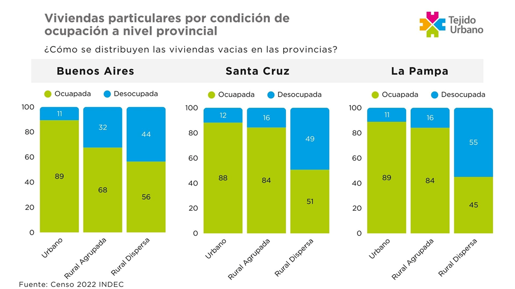 También, cabe destacar la situación de La Pampa y Santa Cruz. En ambas, el porcentaje de viviendas desocupadas en zonas urbanas es del 11%, incluso, en las zonas rurales agrupadas, el porcentaje solo sube al 15%. Sin embargo, si tomamos los datos de las zonas rurales dispersas, el número impacta: en Santa Cruz, el 49,35% de las viviendas se encuentran vacías, mientras que en La Pampa el número llega al 55,05%. Esto se traduce en que, en estas provincias, 1 de cada 2 viviendas ubicadas en zonas rurales dispersas, se encuentra vacía.