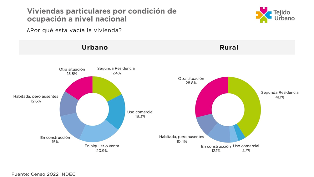 La situación de las viviendas deshabitadas no es la misma en todos los casos. A nivel nacional y en las ciudades, las viviendas que se encuentran deshabitadas al momento del censo, en su mayoría lo están por encontrarse en venta o alquiler, porque se las utiliza como consultorio, comercio u oficina o porque son usadas como segunda vivienda o de fin de semana. Sin embargo, en el ámbito rural, la situación es diferente: las segundas viviendas representan el 41.1% del parque habitacional deshabitado, mientras que en segundo lugar, con el 28.8%, se ubican las