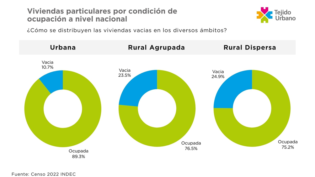 Su distribución entre el ámbito urbano y rural es fuertemente desigual. Mientras que las viviendas vacías dentro del ámbito urbano, a nivel nacional, representa un 10,69%, en el ámbito rural ese porcentaje sube al 24,24%. Esto quiere decir que, mientras que, en las ciudades, cada 100 viviendas, hay en promedio, casi 11 vacías; en las zonas rurales, el número aumenta a 25.